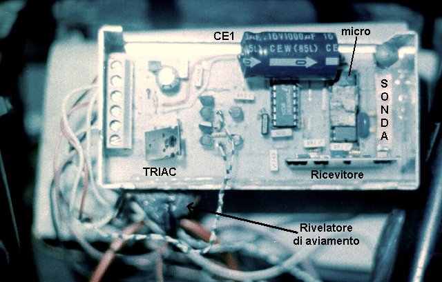 Si notino il TRIAC, il grosso condensatore da 1000mF, l'adesivo sul micro, posto onde evitare che la luce ne cancelli il contenuto (il prototipo utilizza infatti un micro "finestrato", cioè con EPROM), e la sonda, costituita da una lamina vibrante di acciaio con peso all'estremità: un piccolo movimento del veicolo la farà vibrare ed urtare contro una vite (fissata ad una distanza regolabile, per tarare la sensibilità), chiudendo così il contatto che avvisa il micro del movimento del veicolo.