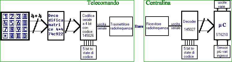 Esaminando lo schema a blocchi si nota come il controllo dell'antifurto avvenga attraverso un sistema a radiofrequenza formato dai seguenti blocchi